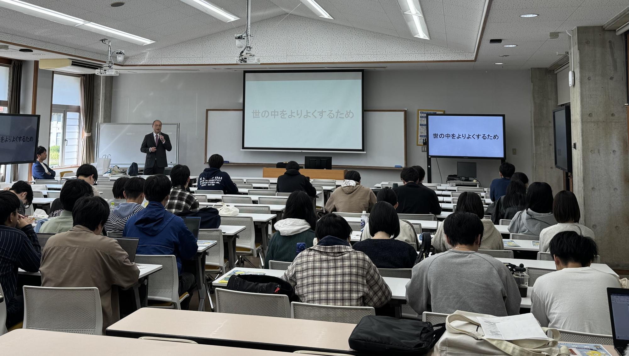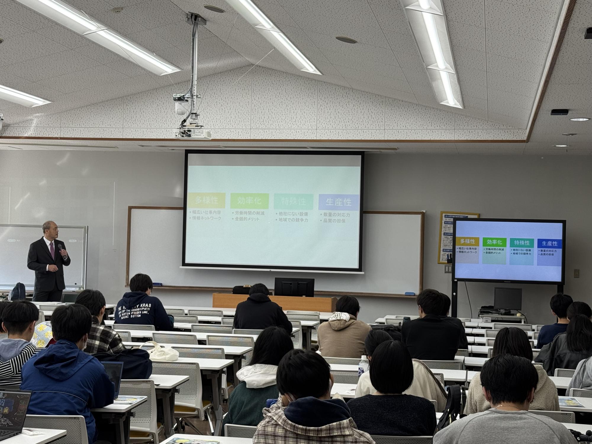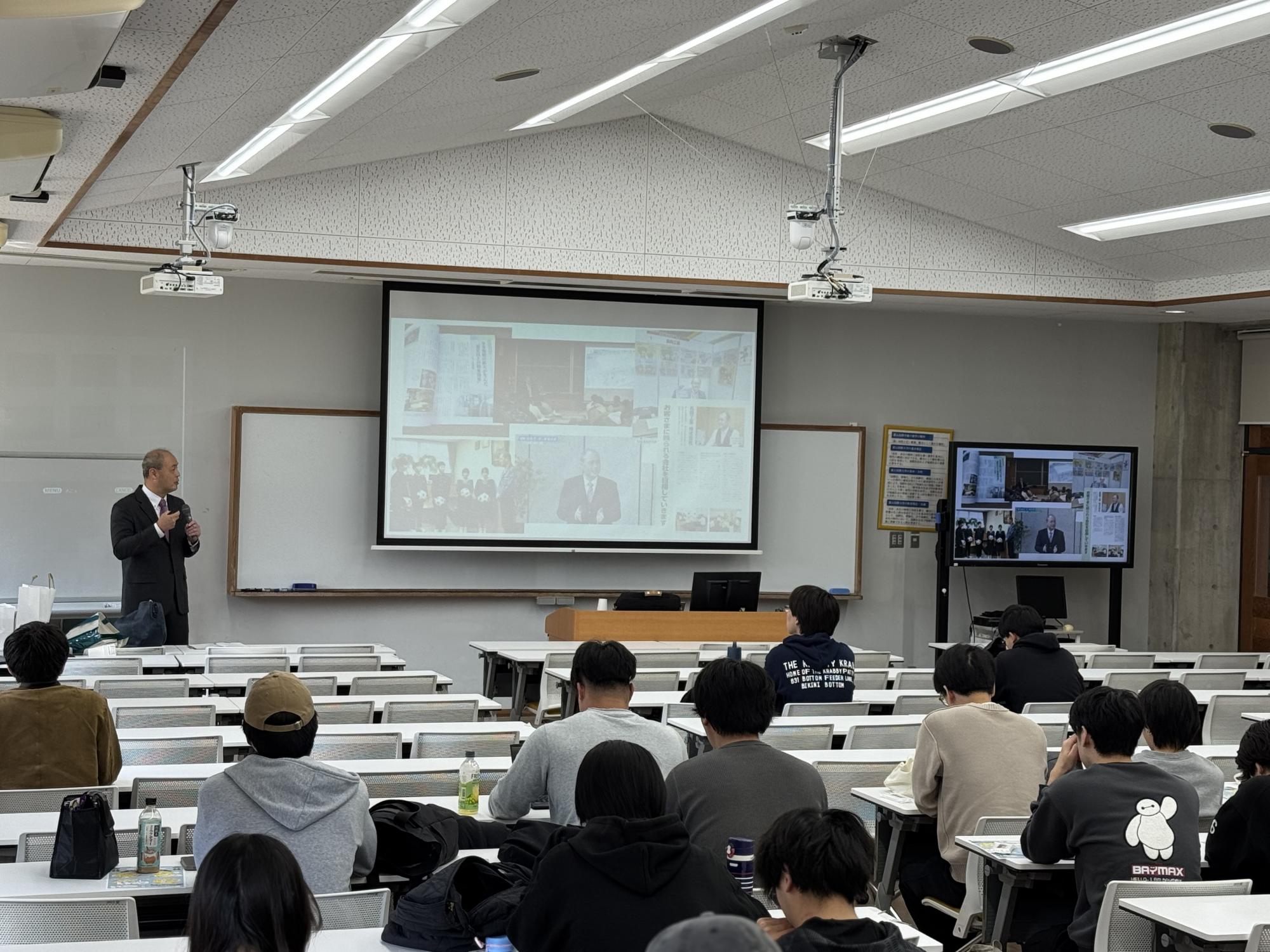 11月7日、富山国際大学の「経営管理講座」にて社長が講師を務めました。富山国際大学で講演を行わせていただくのは今年で4度目となります。